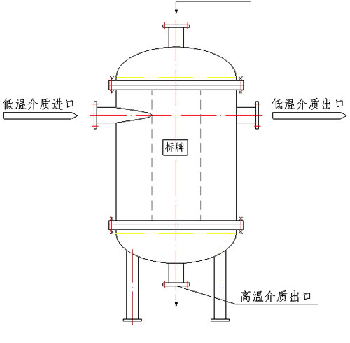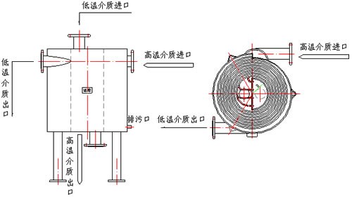 ○2可拆式Ⅱ型 可拆式Ⅱ型換熱器管內通道為閉式,介質螺旋狀運行,管外通道介質上下直通運行,主要適用于無壓力或兩個通道壓差大的場合,管內通道走壓力大、腐蝕嚴重者。這樣可節省材料且布局更趨合理性。